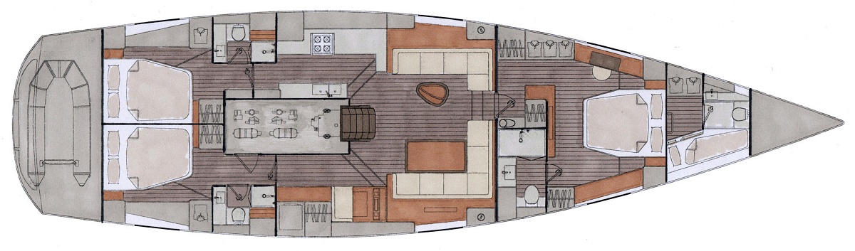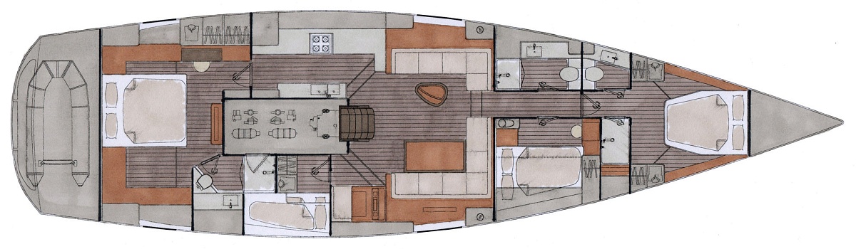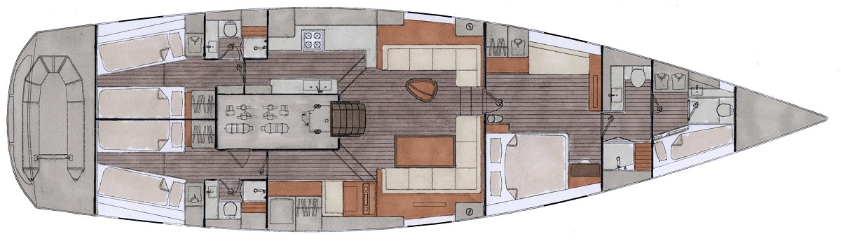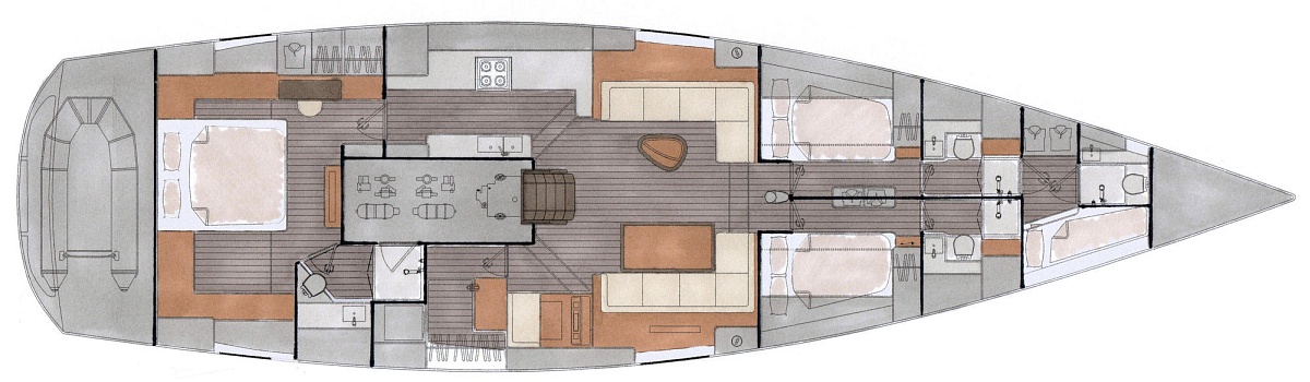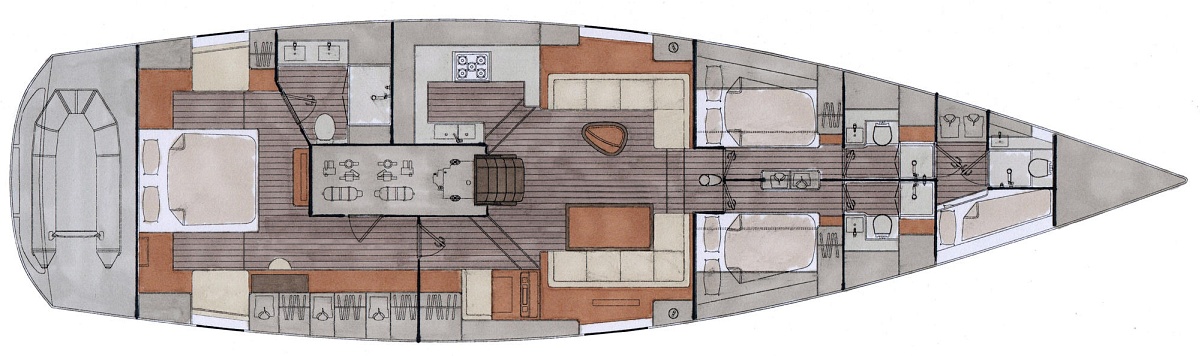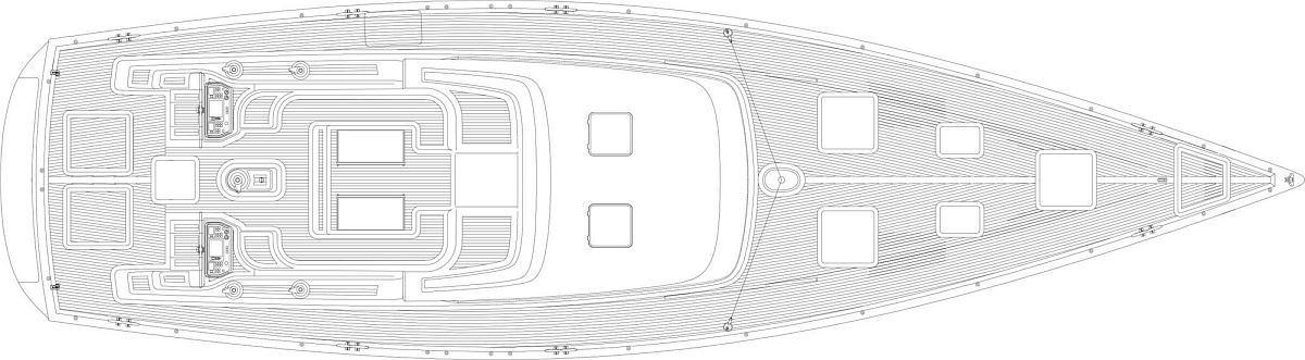 Stylizacja obejmuje ponadczasowy niski profil nadbudówki. Wybór opcji ożaglowania obejmuje zintegrowany bukszpryt, roller w maszcie grota lub w bomie.