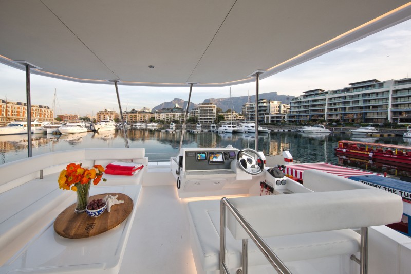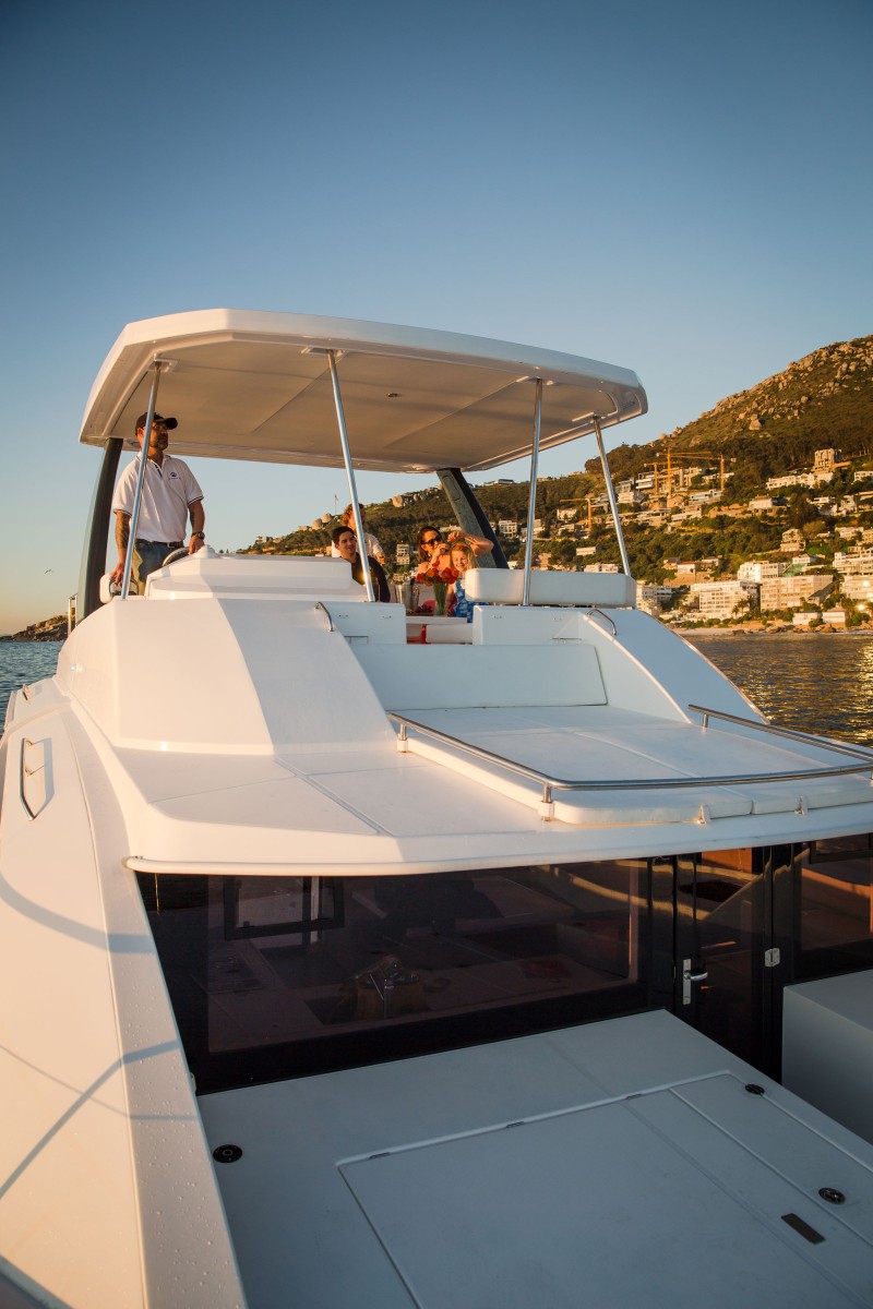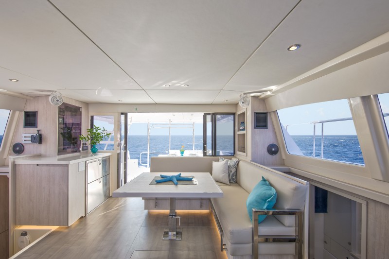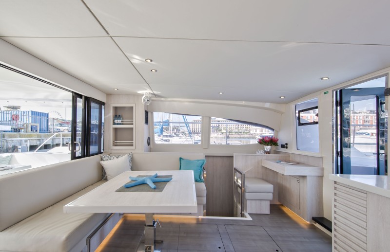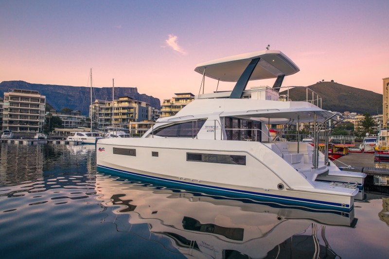 Moorings 433 PC posiada duży flybridge z grillem, barem i bezpośrednim dostępem do znajdującej się na dziobie platformy do opalania. Wewnątrz, z przodu znajduje się kuchnia, a za nią umiejscowiony jest stół z kanapą zwróconą do przodu. Ten rozkład przestrzeni wraz z rozsuwanymi drzwiami szklanymi pomiędzy kanapą, a kokpitem rufowym oraz drzwiami na dziób, zapewnia panoramiczny widok 360°, stwarzając odczucie połączenia wnętrza z przestrzenią na zewnątrz.