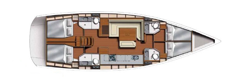 Każda z czterech kabin posiada łazienkę, a dodatkowe dwa miejsca do spania znajdują się w salonie, co pozwala na zakwaterowanie nawet 10 osób.