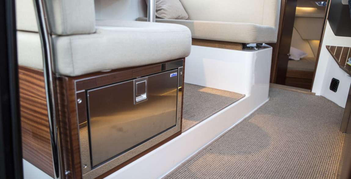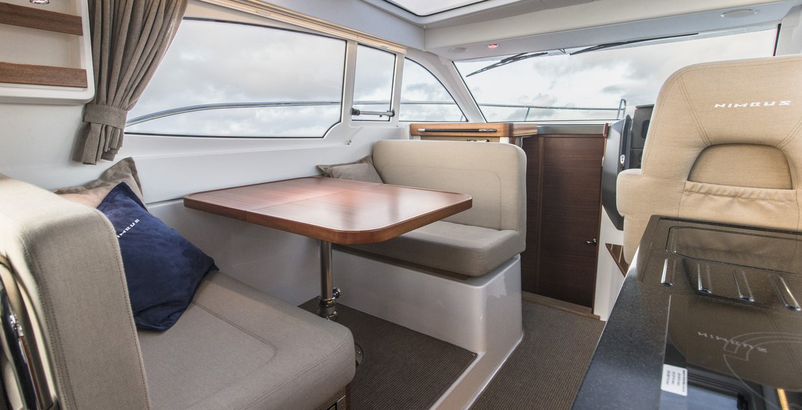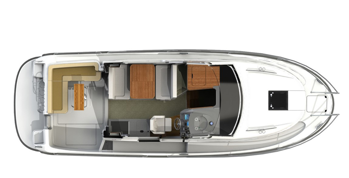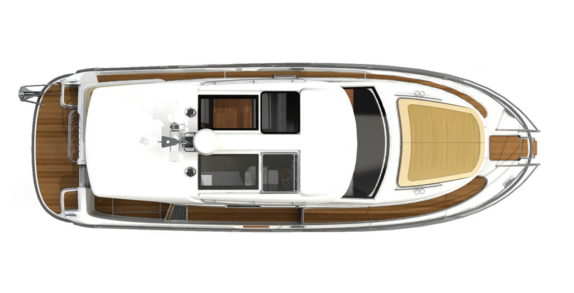 Tylni pokład posiada duże i wygodne kanapy w kształcie litery L dla pięciu osób oraz stołem pozwalającym skosztować posiłki na pokładzie jachtu. Pokład rufowy nadaje się idealnie do wypoczynku lub wspólnych rozrywek z przyjaciółmi i rodziną. Wnętrze jachtu zostało wykonane z wysokiej jakości materiałów tworząc w ten sposób wspaniałą atmosferę, w szczególności w odniesieniu do przestrzeni i światła. Łódź posiada zintegrowaną wentylację i pięć dużych okien dla dodatkowego dostępu światła. Meble tapicerowane w jasnych kolorach pomagają w redukcji hałasu. Łódź ma dwie kabiny. Kabinę dla właściciela (dostępną z łóżkiem typu Queen lub V-dostawki) oraz kabine dla gości. Jacht 305 Coupé to nowoczesny, niezwykle funkcjonalny model.